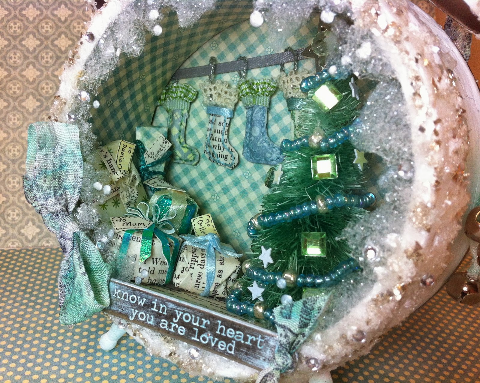 Here is a view of the inside of my clock. I have used one of the Idea-ology Christmas trees and I dyed it (and my hands!) using Evergreen Bough Distress Ink and then decorated it with a beaded garland and jewels and sequins. I found the perfect silver star charm for the topper! It was fab to play with miniatures like this and I am already planning an Autumn, Summer and Spring clock too!!!!