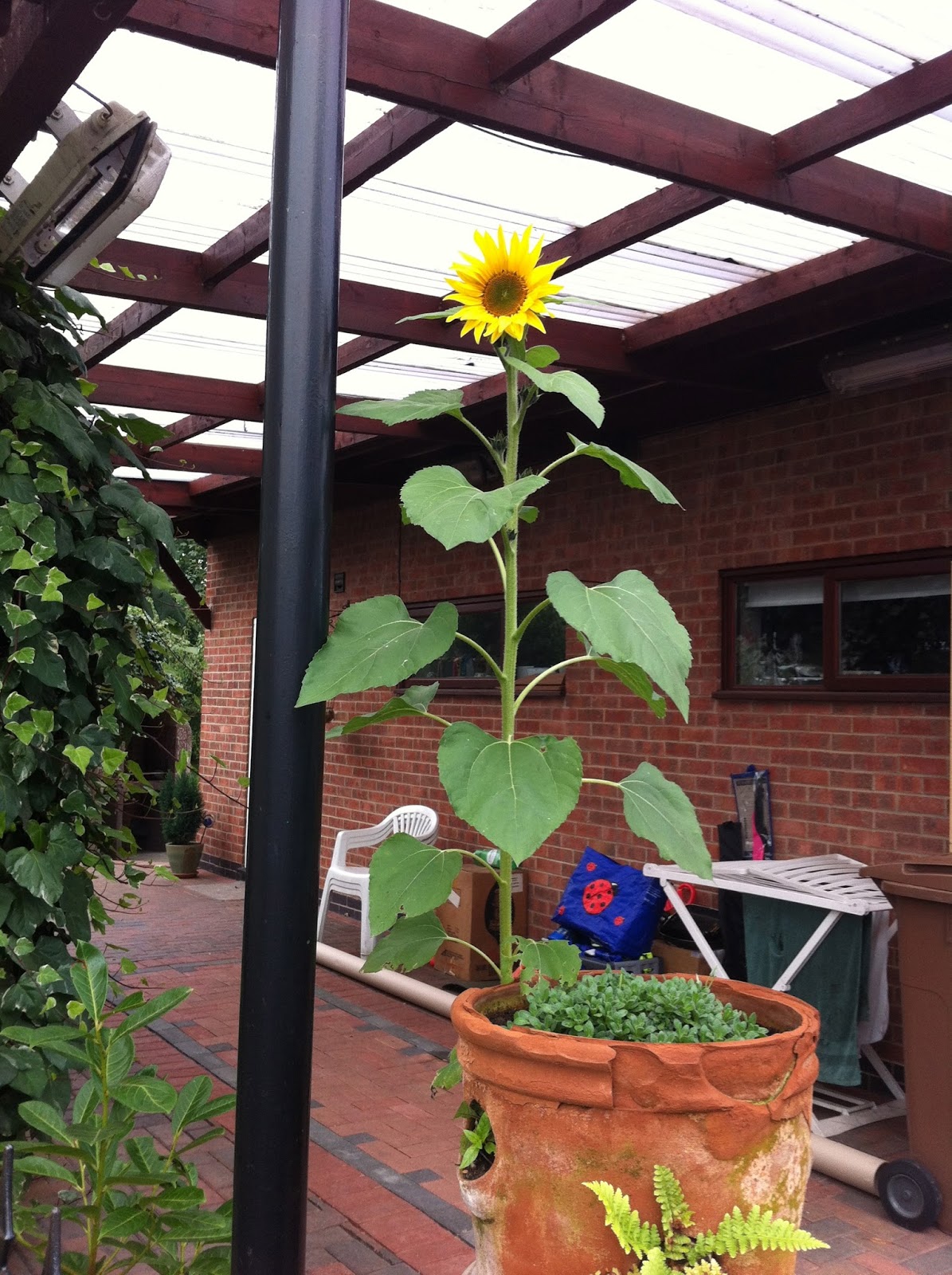 Please excuse the junk in the background of the photo - we are getting ready for a car boot sale! Concentrate instead on the lovely sunflower that magically appeared this year. I am glad it is a miniature on rather than a giant one! You can see the windows of my craft room too in this photo. Unfortunately I can't see the sunflower just the roof of the carport when I am sat at my desk :-(
