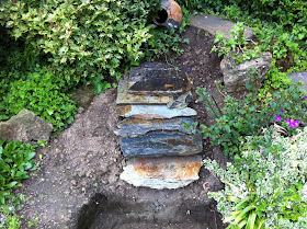 Here is a work in progress.  A water feature waiting for the water to stop so I can get the waterproof liner fitted and then we might have a pretty water feature instead of a muddy hole!